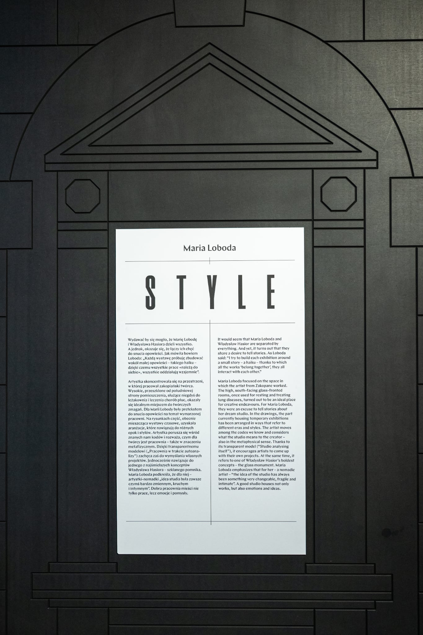 Wydawać by się mogło, że Marię Lobodę i Władysława Hasiora dzieli wszystko. A jednak, okazuje się, że łączy ich chęć do snucia opowieści. Jak mówiła bowiem Loboda: „Każdą wystawę próbuję zbudować wokół małej opowieści – takiego haiku – dzięki czemu wszystkie prace «należą do siebie», wszystkie oddziałują wzajemnie”. Artystka skoncentrowała się na przestrzeni, w której pracował zakopiański twórca. Wysokie, przeszklone od południowej strony pomieszczenia, służące niegdyś do leżakownia i leczenia chorób płuc, okazały się idealnym miejscem do twórczych zmagań. Dla Marii Lobody były pretekstem do snucia opowieści na temat wymarzonej pracowni. Na rysunkach część, obecnie mieszcząca wystawy czasowe, uzyskała aranżacje, które nawiązują do różnych epok i stylów. Artystka porusza się wśród znanych nam kodów i rozważa, czym dla twórcy jest pracownia – także w znaczeniu metafizycznym. Dzięki transparentnemu modelowi („Pracownia w trakcie autoanalizy”) zachęca zaś do wymyślania własnych projektów. Jednocześnie nawiązuje do jednego z najśmielszych konceptów Władysława Hasiora – szklanego pomnika. Maria Loboda podkreśla, że dla niej – artystki-nomadki „idea studia była zawsze czymś bardzo zmiennym, kruchym i intymnym”. Dobra pracownia mieści nie tylko prace, lecz emocje i pomysły.